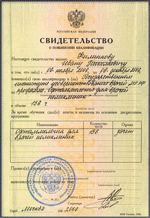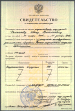 Сертификат о присвоении звания врача первой категории в 2003 году>>